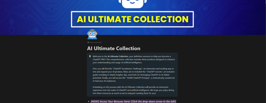 Welcome to the AI Ultimate Collection, the only resource you'll ever need to transform yourself into a ChatGPT expert. This meticulously crafted collection is your golden ticket to mastering the art and science of artificial intelligence, specifically tailored to enhance your understanding and skills in ChatGPT. Whether you're a beginner eager to learn the basics or an experienced user looking to delve into advanced features, this collection has everything you need and more.